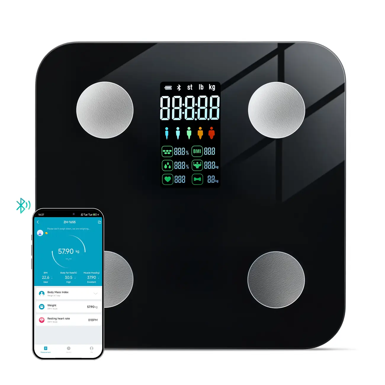 Sparoma ZJ08 Digitale Körperanalysewaage mit Farb-LCD – Batteriebetrieben (4×AAA Nicht Enthalten), Bluetooth Körperfett- & Herzfrequenzmessung mit App-Verbindung