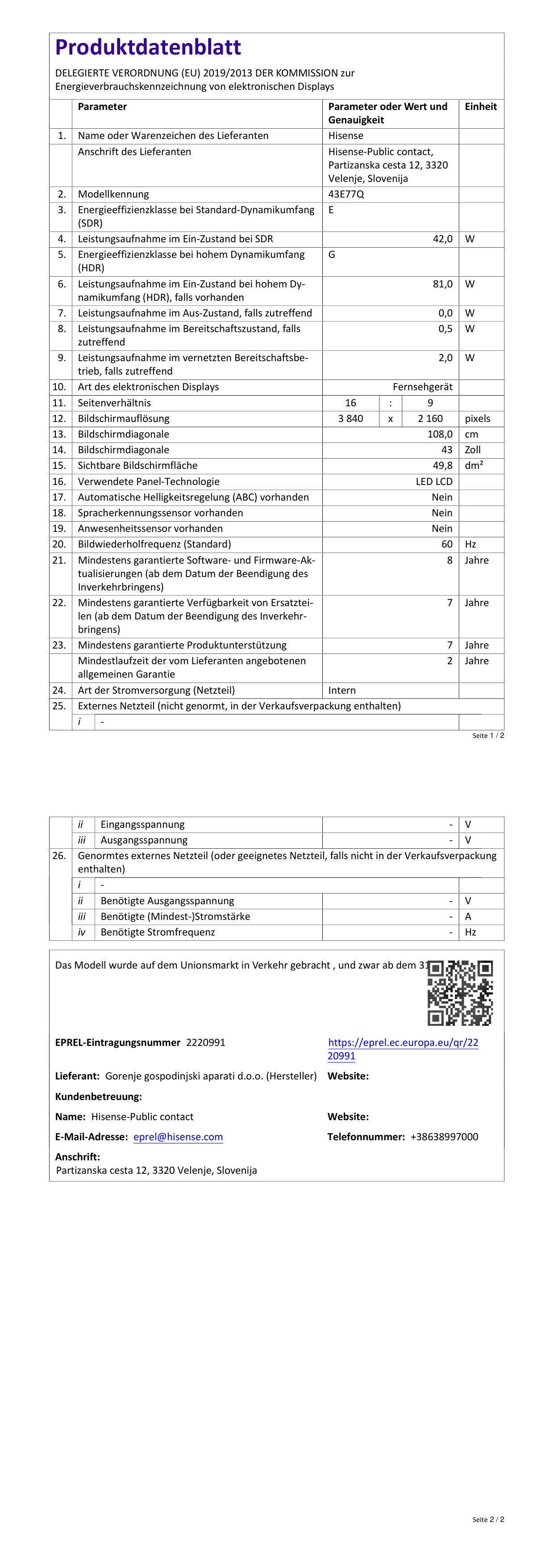 Hisense 43E77Q, QLED TV, 108 cm, UHD, schwarz