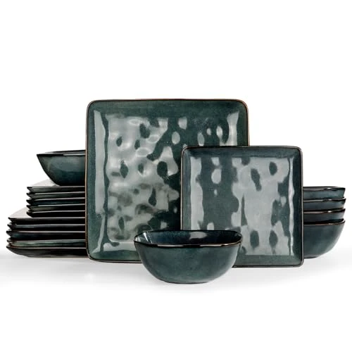 Richmount Steingut Geschirrset für 6 Personen, Serie Ocean, 18‑tlg, quadratisches Geschirrset, Teller‑Set Kombiservice mit Reaktivglasur, kratzfestes Tafelservice, Geschirrsets, dunkelgrün