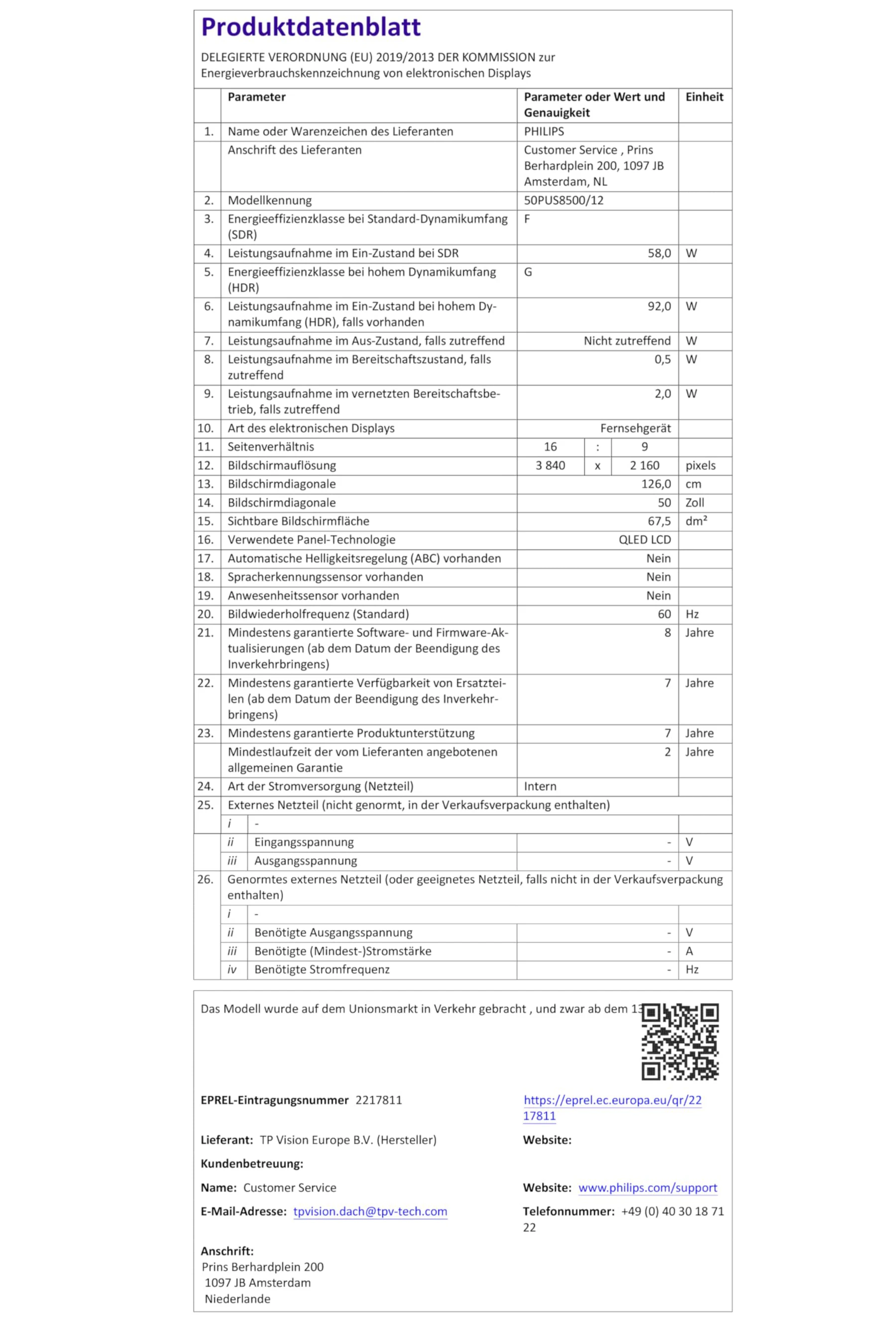 Philips Ambilight 50PUS8500 4K LED Smart TV – 50 Zoll Display mit Pixel Precise Ultra HD, Titan OS, Dolby Vision und Dolby Atmos Sound [Energieeffizienzklasse F]