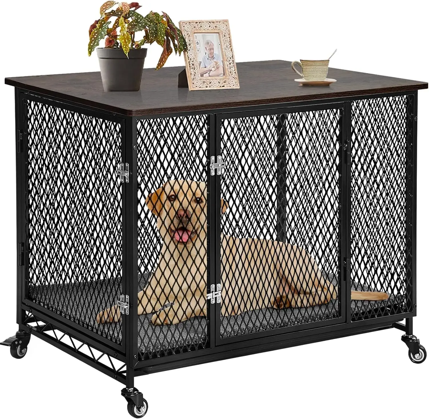 aivituvin Hundehaus-Möbel, großes, bewegliches Hundehaus für Zuhause, Innenzwinger aus Holz mit Kissen, Ablagefach und Drahtboden, für kleine bis große Hunde (Schwarz, XL)