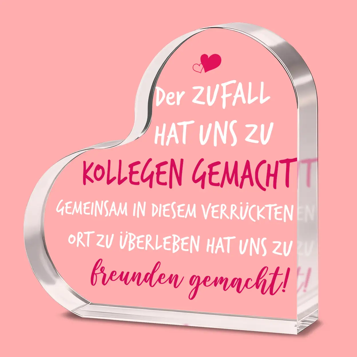 Alphynix 1 Stück Herz-Plakette „Der Zufall hat uns zu Kollegen gemacht - Gemeinsam in diesem verrückten Ort zu überleben, hat uns zu Freunden gemacht!“, Geschenk aus Acryl mit pinken Herzen, Büro-Freundschaft-Erinnerungsstück