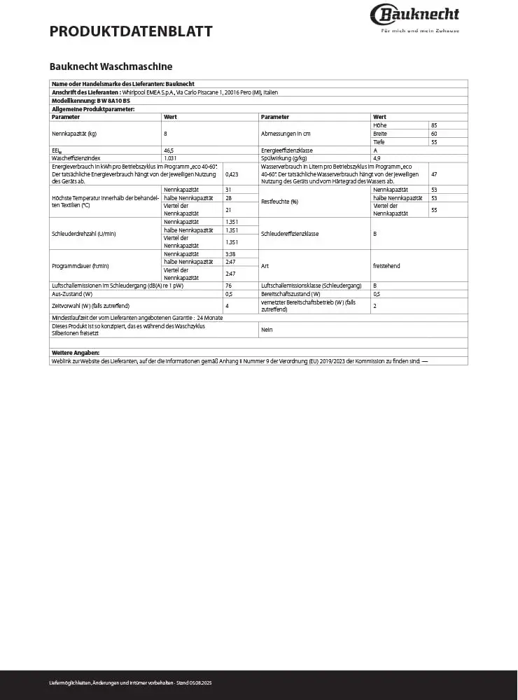 Bauknecht B W 8A10 BS Frontlader Waschmaschine/ 8 kg/ 1400 U/min/ Dampftherapie/ Adaptive Waschfunktion/ Kaltwäsche/ Dampftechnologie/ Home Whiz, weiß [Energieeffizienzklasse A]