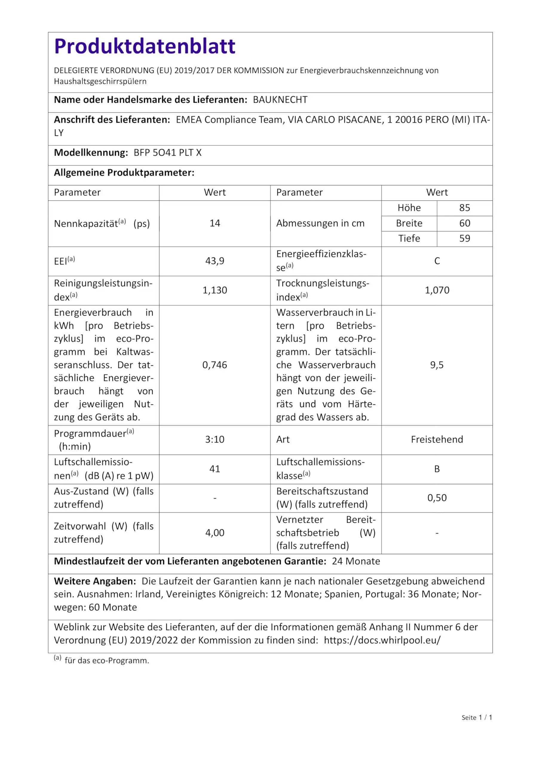 Bauknecht BFP 5O41 PLT X Freistehender Geschirrspüler, 60 cm, 14 Maßgedecke, 10 Standardprogramme und 1 Sensorprogramm, PowerClean, ActiveDry, ProComfort Messerschublade, Vollwasserschutz [Energieeffizienzklasse C]