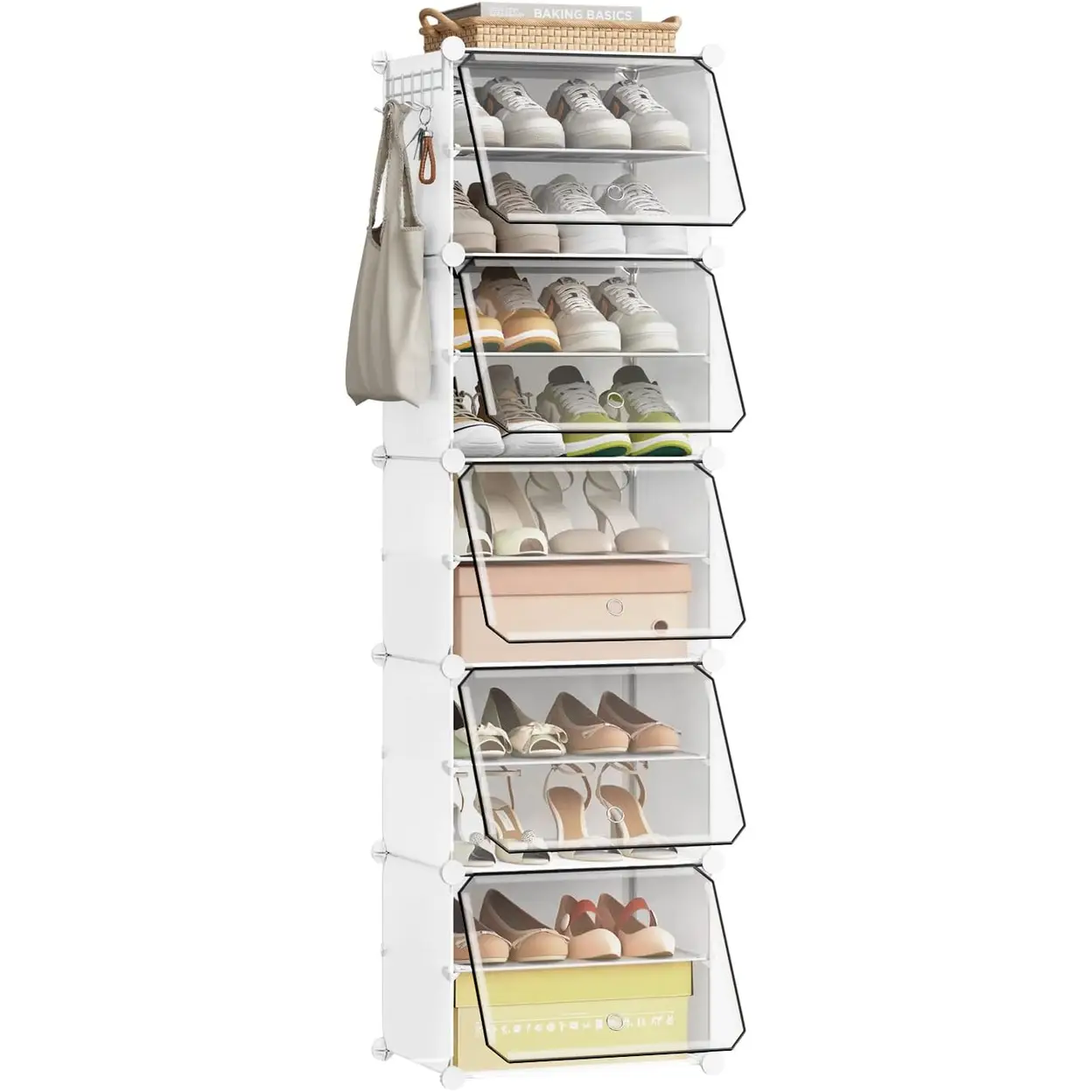 eSituro Stapelbares Schuhregal, Modulares DIY Aufbewahrungsregal mit 12 Fächern, mit Türen und Haken, für 12 Paar Schuhe, PP-Platten, mit Hammer, Schwarz