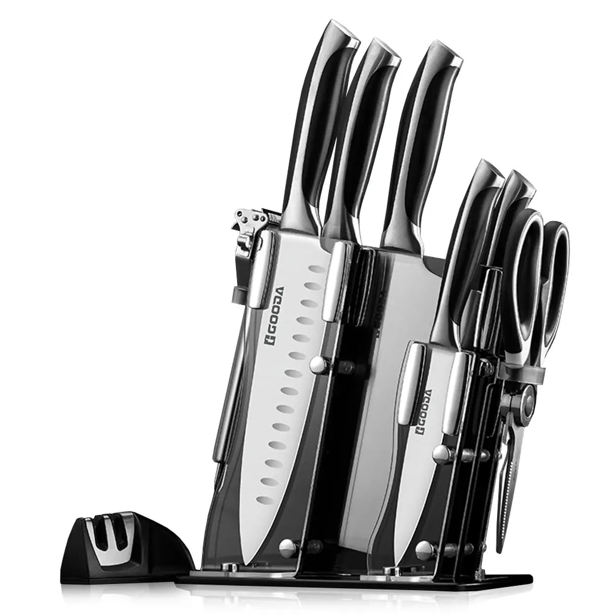GOODA 9-teiliges Chefmesser-Set aus Edelstahl mit drehbarem Acryl-Messerblock, scharf, antihaftbeschichtet, Messerblock-Set, für die Küche, mit Schärfer, zum Schneiden, Würfeln, Hacken