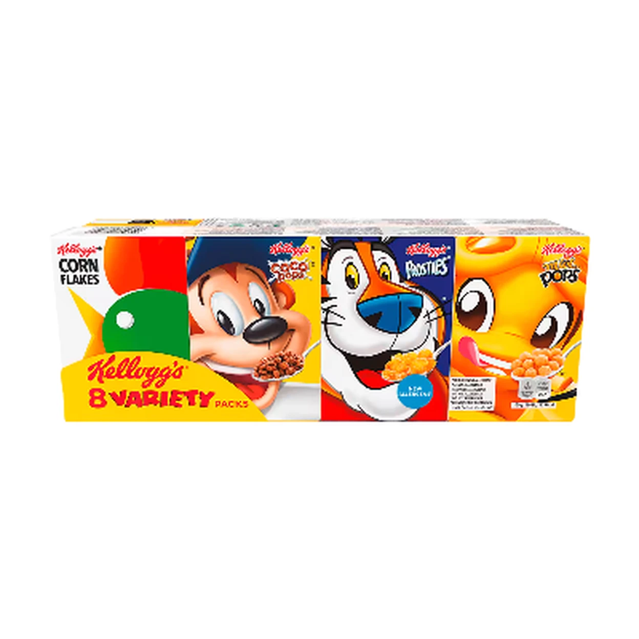 Diese Kellogg's 8 Vielfalt Packung bietet eine köstliche Auswahl an acht beliebten, einzeln verpackten Müslis.Genießen Sie die knusprigen, mit Honig gesüßten Ringe der Honey Bsss Pops, die klassischen Frosties, die originale Corn Flakes und die schokoladigen Reis-Knusperflocken von Choco Krispies und Choco Krispies Chocos.Diese praktische, portionierte Packung bietet eine köstliche und abwechslungsreiche Frühstücks- oder Snack-Option für alle, mit Cerealien ohne künstliche Farbstoffe oder Süßungsmittel.