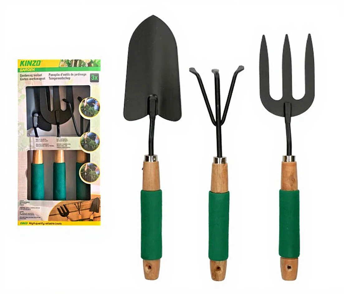 Kinzo 3-teiliges Garten-Set mit Handrechen, Gabel und Handschaufel, Metall mit Holzgriff und Softgriff, Antihaftbeschichtung