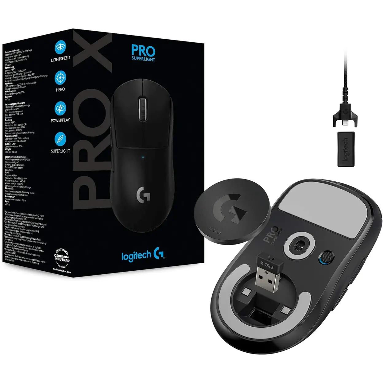 Logitech G PRO X SUPER LIGHT kabellose Gaming-Maus mit HERO 25K-Sensor, ultraleicht mit 63g, 5 programmierbare Tasten, bis zu 70 Stunden Akkulaufzeit, incl. Zero additives PTFE-Füße, PC / Mac, Schwarz
