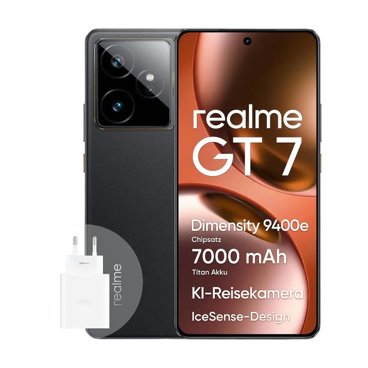 realme GT 7 Smartphone 5G 12+512 GB, Dimensity 9400e Flaggschiff-Chipsatz, 7000 mAh Titan-Akku, 6000 Nits Display, 50 MP IMX906 OIS Kamera, Al-Planer, IP69, IceSense Schwarz