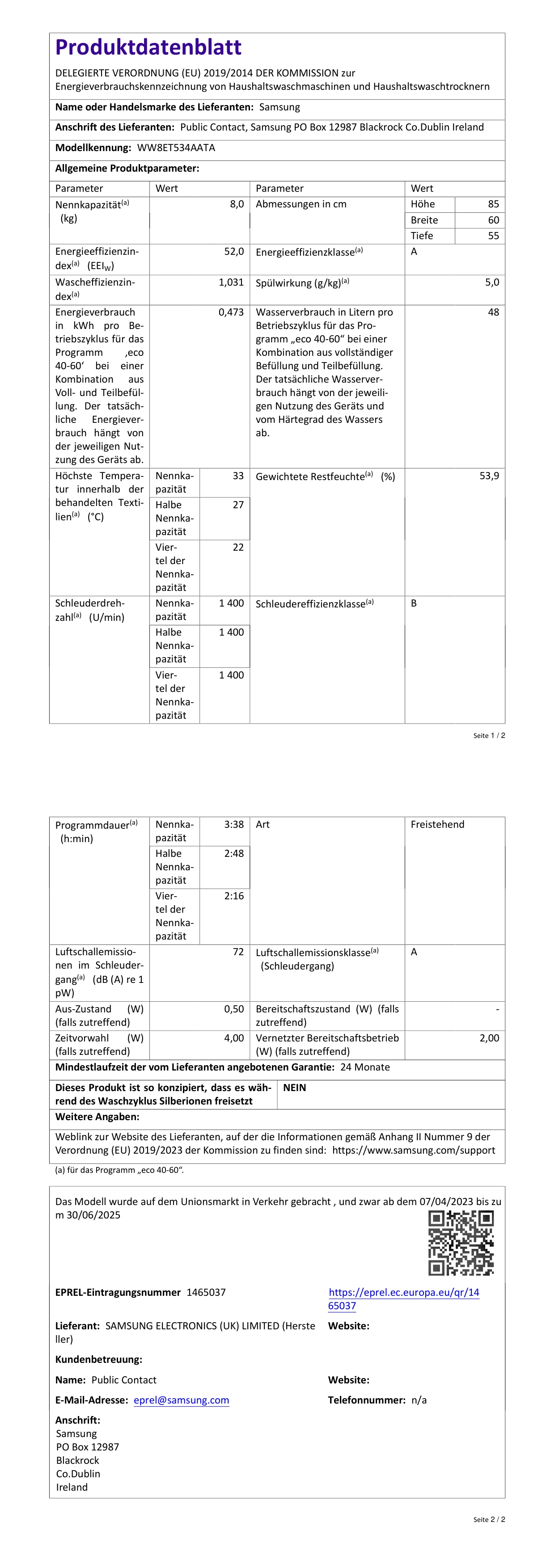 Samsung Waschmaschine, 8 kg, 1400 U/min, Ecobubble, automatische Waschmittel- und Weichspülerdosierung, weiß/schwarz, WW8ET534AATAS2 [Energieklasse A]