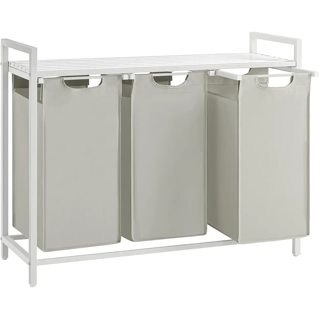 VASAGLE Wäschekorb 3 Fächer, Wäschesammler mit Ablage, Wäschebox, Wäschesack aus Oxford-Gewebe abnehmbar, Metallrahmen, 3 x 40 L, 92,5 x 33 x 72 cm, cremeweiß-mattweiß