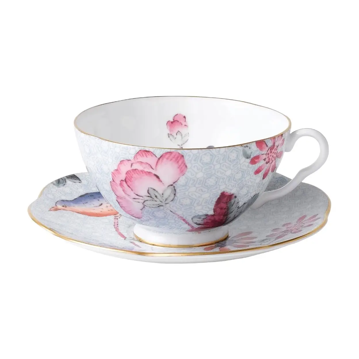 WEDGWOOD Cuckoo Fein Bone China Teetasse & Untertasse Set mit 22K Goldrand - Blaues Blumenmuster