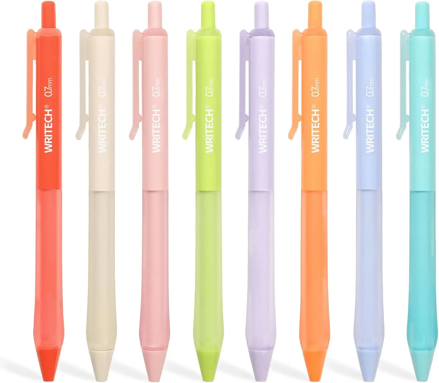 WRITECH Retraktible Gelroller: Feine Spitze 0,7 mm, gemischte Farben, weicher Griff, 8 Stück, kein Durchschreiben & Verlaufen, besonders glatte Schreibspitze, Kugelspitze, bunte Stifte fürs Journaling und Kolorieren