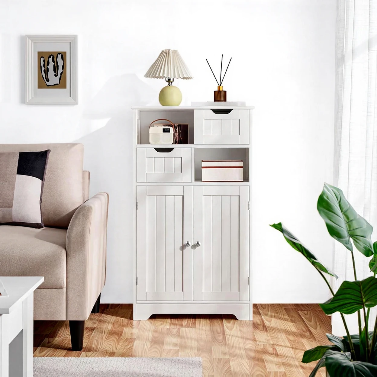 Yaheetech Badezimmerschrank, Sideboard, Badezimmerschrank, Kommode mit 2 Holzschubladen, Aufbewahrungsschrank, verstellbares Regal, offenes Fach, 60 x 30 x 104,5 cm, für Wohnzimmer, Badezimmer